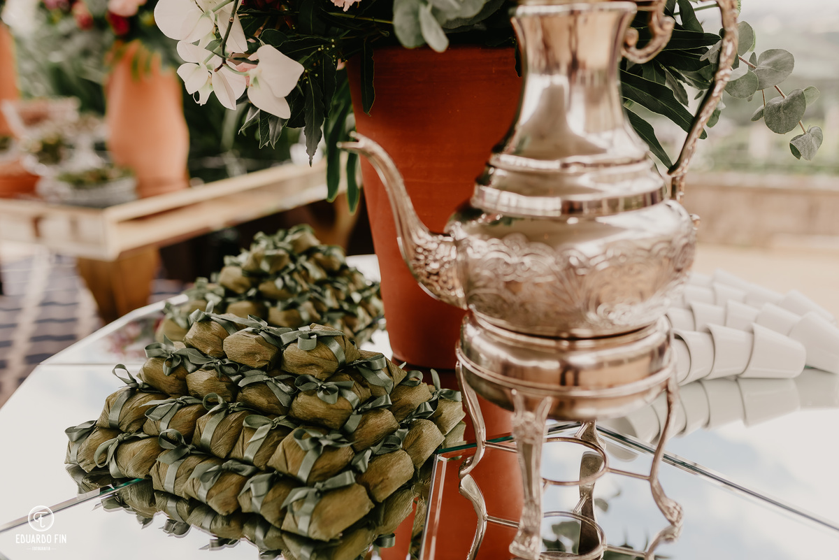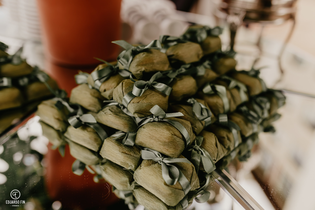 Para a lembrança foram escolhidos os Bem-Casados, doce muito tradicional nos casamentos, além de complementar na decoração feita pelas mãos da Márcia da Pétala.